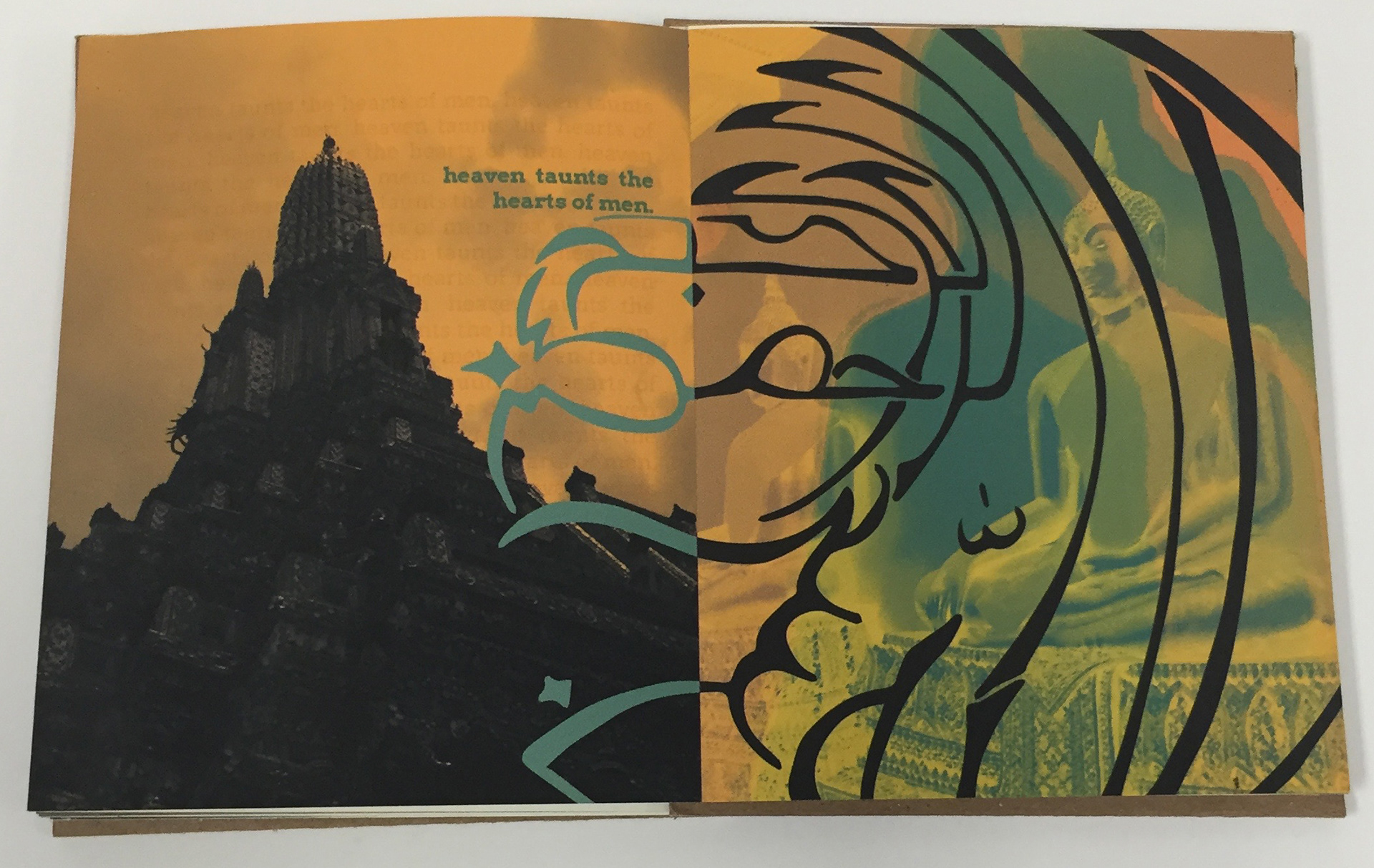 A collage concertina book assembled by hand contemplating themes of mental health and spirituality. This piece was handcrafted in a series of three, one of which was displayed as part of a summer art show and then held at the Murray Library artist book archive.