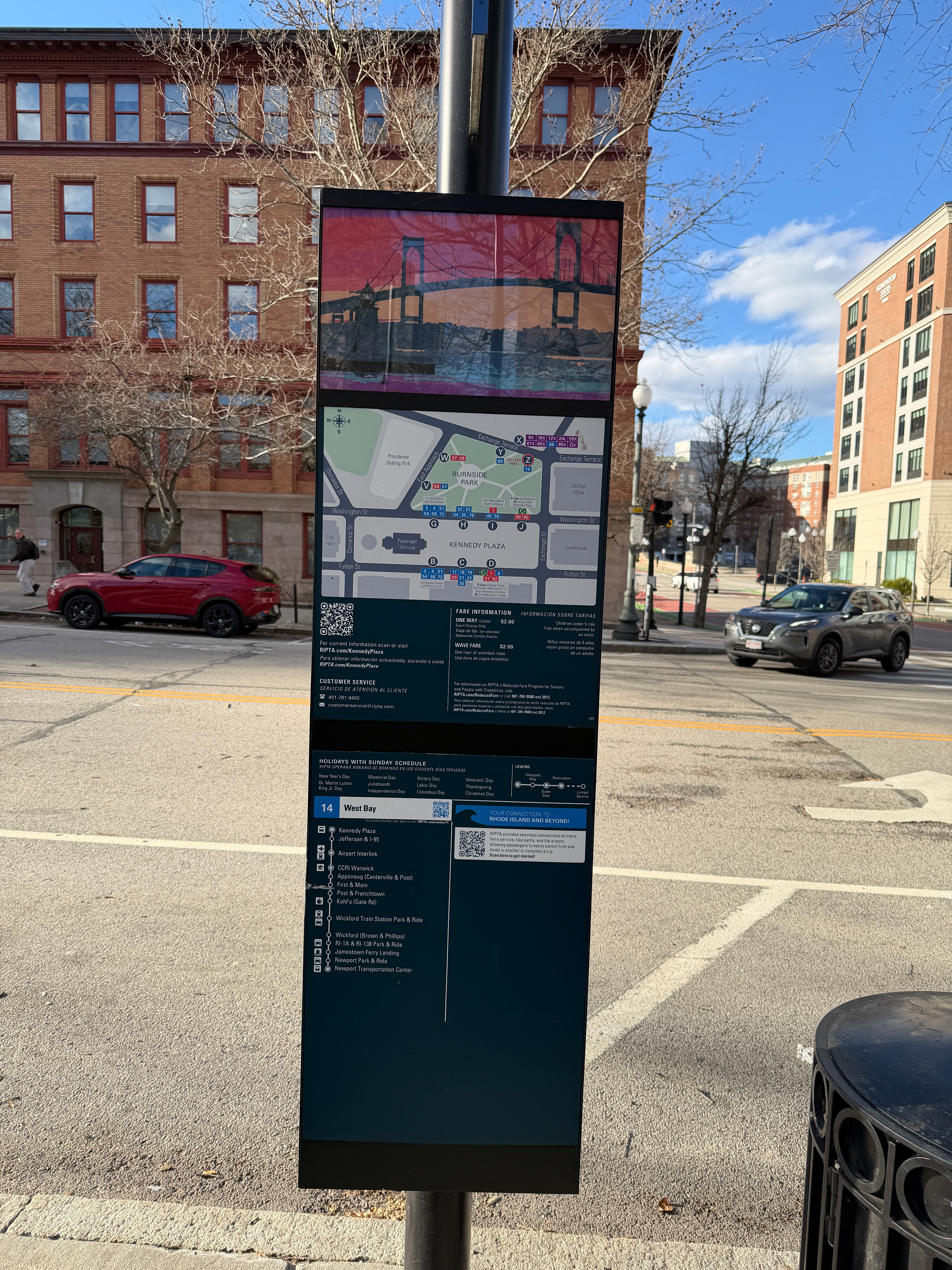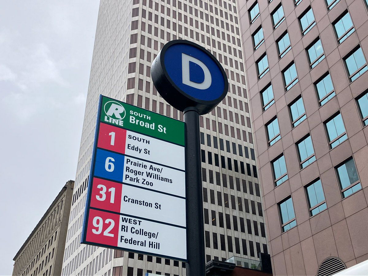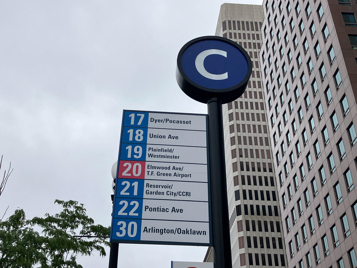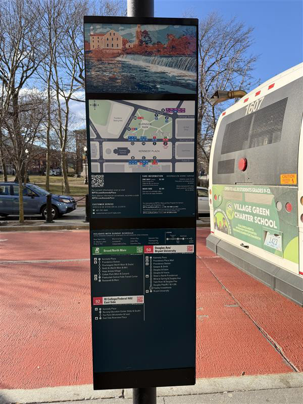 Kennedy Plaza is the main transfer node for the Rhode Island Public Transportation Agency (RIPTA). Along with a refresh of several other customer-facing elements such as the system map and route schedule pamphlets, I was approached to refresh the bus stop signage for this important transit hub. Previous bus stop flags had inconsistent styles and spacing and low color contrast, making it hard to spot routes from a distance. The refresh sought to unify each element with the new look rolling out elsewhere in the agency and update the flags, terminal map, and route ladders with an easier-to-scan design philosophy. I also created vector artwork to fill the emergency notice area of the signage assembly to brighten the area when no notices were posted. The following are examples of review lockups showing each element of each bus stop bay.